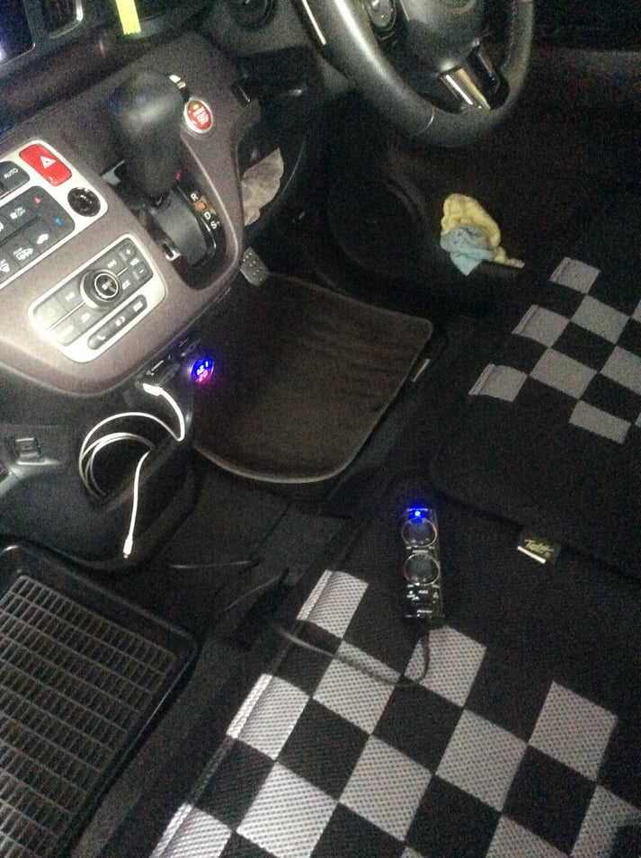 車両前方、助手席左側からダッシュボード間での配線作業の様子。