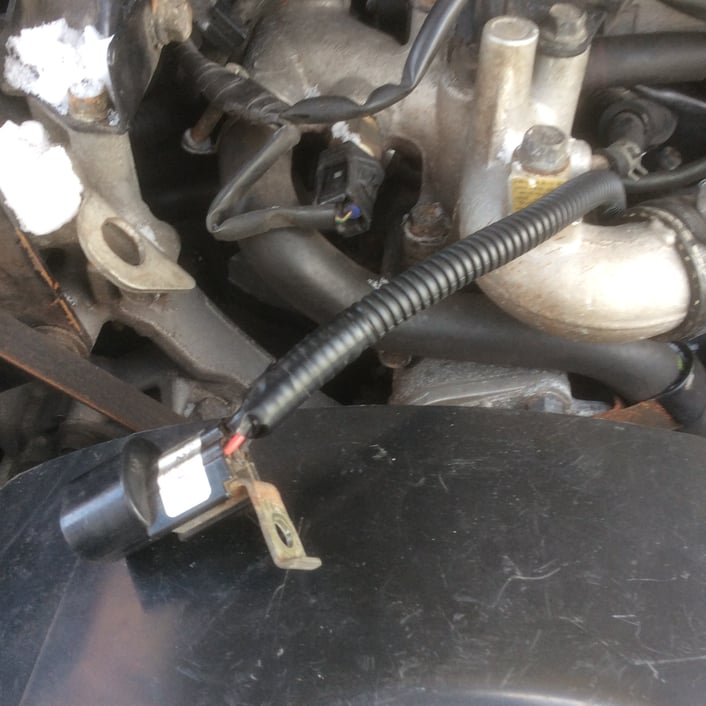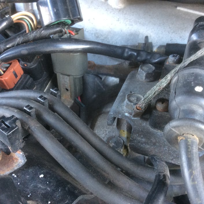 エンジン中央上部に設置されていた、クランク角センサーモジュールのカプラをみつけましたので、カプラを抜きショートさせてみたところ、「あれ?」ショートが止まったじゃありませんか。