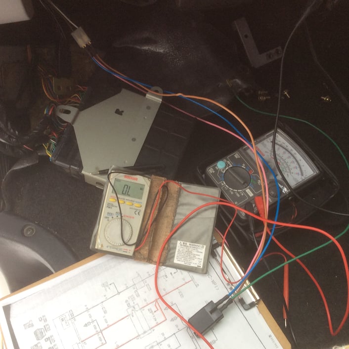 そして最初のポイントを確認できたら、図面をもとに本当にその配線が図面どおりになっているのか、直接ヒューズボックス内の端子とそのポイントが導通しているのか、別系統にて配線をひき