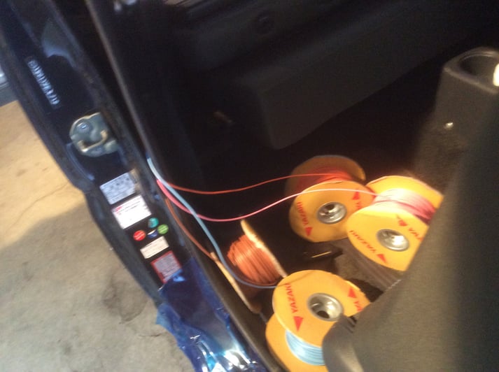 運転席後ろに、各配線のリールを置いて、必要な分の配線をひいていきます。