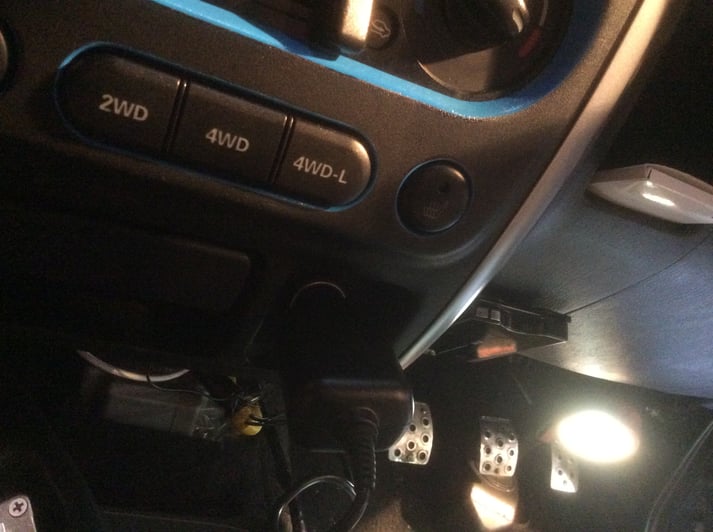 運転席下側周りを、仮つけにて配線を固定したので、スイッチボックスの固定場所を確保します。