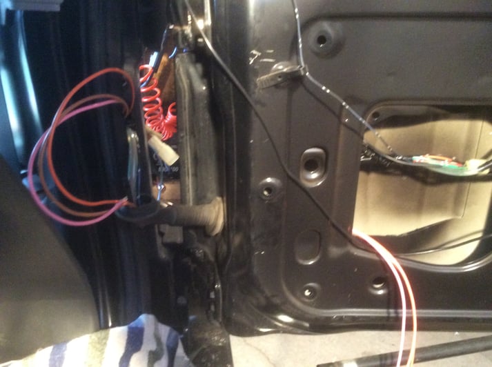 ドアヒンジ部のジャバラの中に配線を入れていきます。