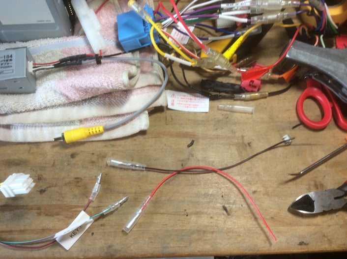 同時進行にて、車速信号等の信号線を取り出すために、専用のハーネスを作成していきます。