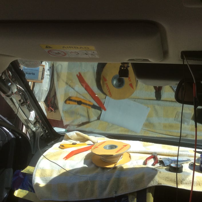 TV用のフイルムアンテナを貼り付け、同配線の他、ETCアンテナ、カーナビマイク、バックミラー連動映像ケーブル等を一緒にひいていきます。