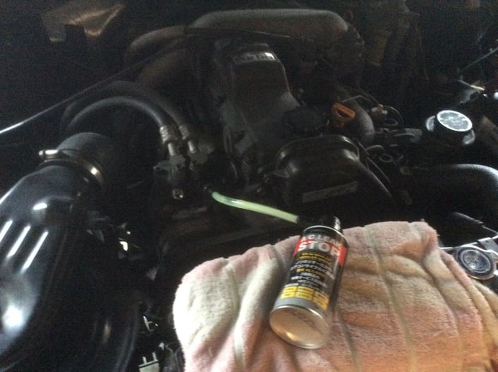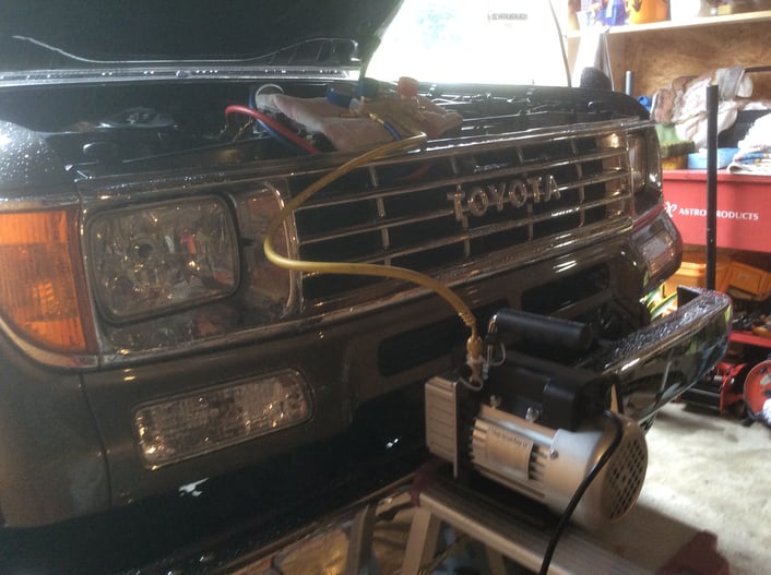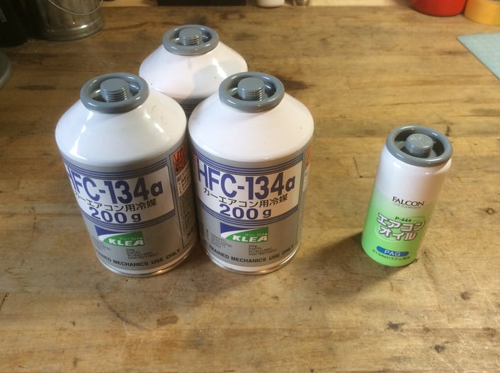 真空引きガスチャージを実施、ほどなくしてエアコンガスとコンプレッサオイルを入れていきます。