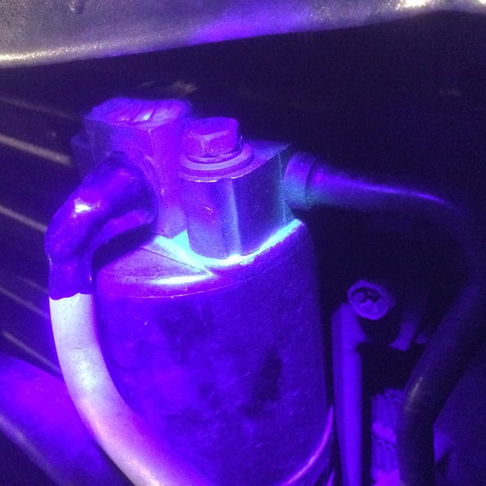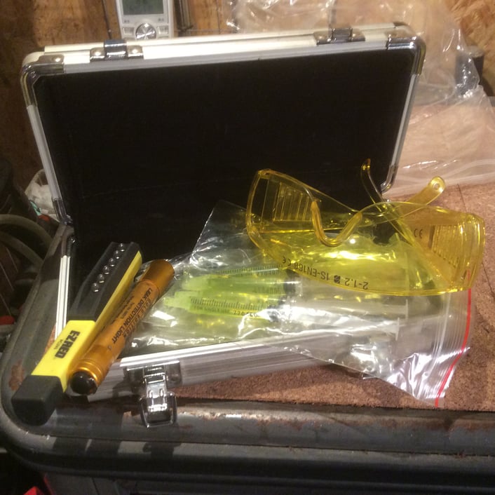 今回、使用したのが、ガス漏れ探査剤を注入して、紫外線ライトを照射しての点検がメインでした。