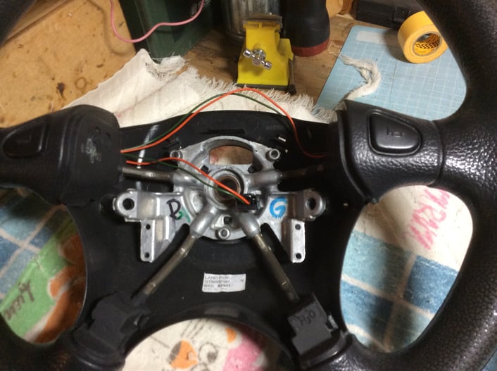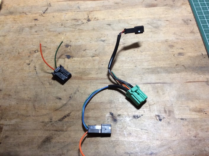 左右のホーンスイッチから、オレンジと緑色の配線で、カプラーにつながっています。