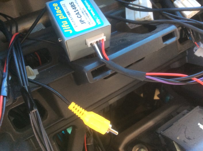つまり、バックカメラ(専用4ピンカプラ)→JP-CA14BS(4ピンカプラ入力、RCA出力)→ナビ