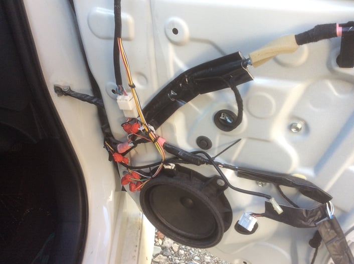 運転席側ドア内装パネルを取り外して、周辺の配線の状態を確認します。