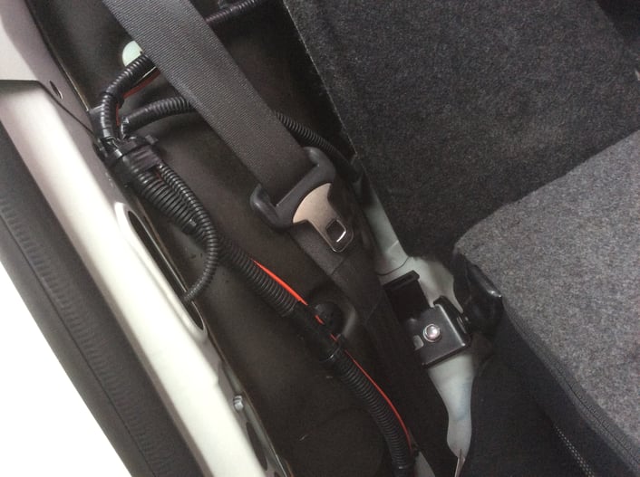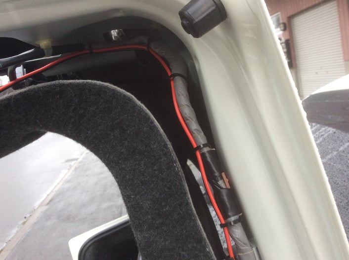トランク部まで、配線を新設、トランクのヒンジ部へ、コルゲートにて養生した配線を引いていきます。