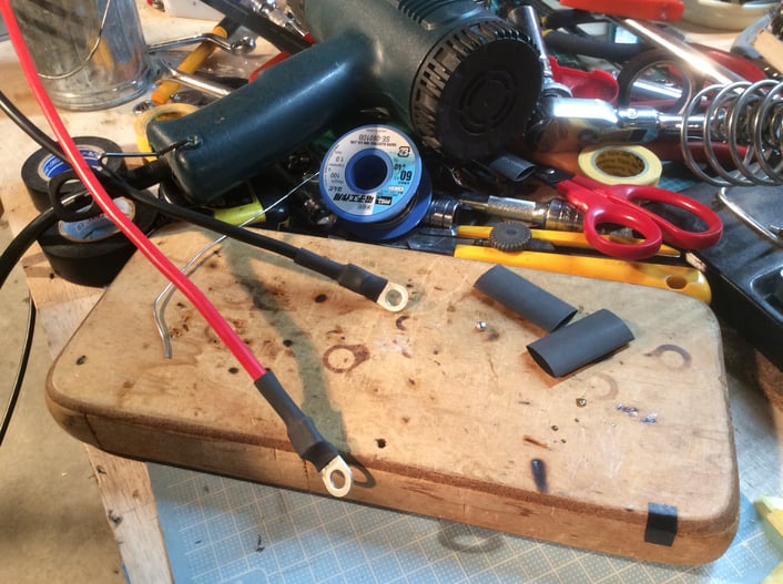配線に圧着する端子にハンダ溶着している様子。
