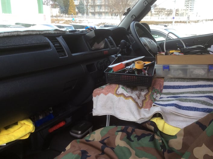 入庫した自動車はフルサイズのハイエース、前回もハイエースのサブバッテリーの作業がありましたが、
